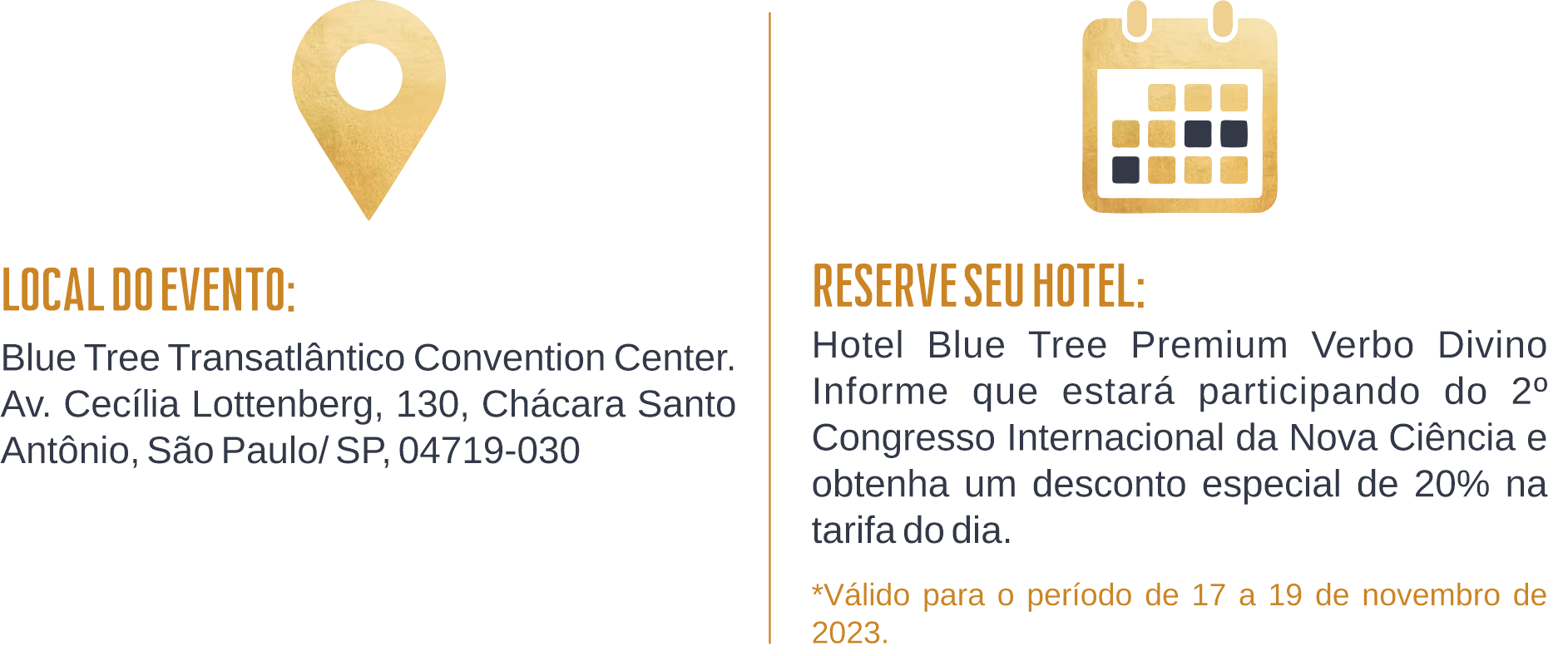 Hotel Blue Tree Premium Verbo Divino Informe que estará participando do 2º Congresso Internacional da Nova Ciência e obtenha um desconto especial de 20% na tarifa do dia.*Válido para o período de 17 a 19 de novembro de 2023.