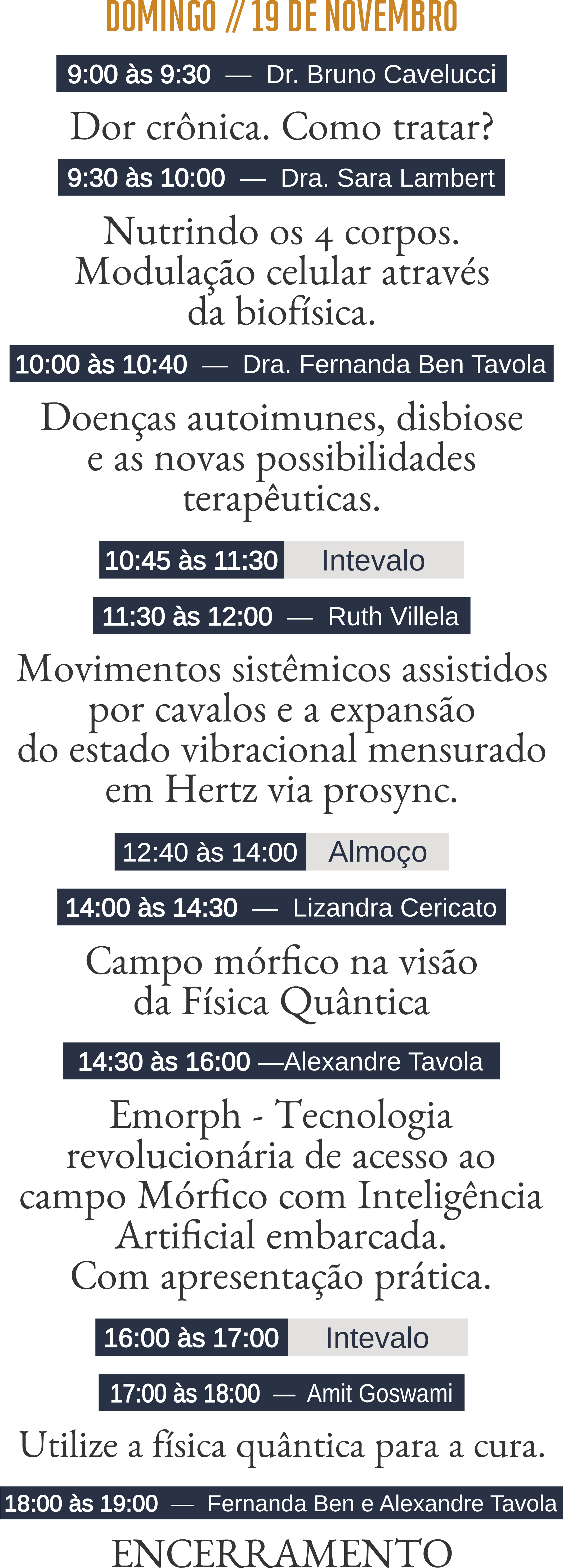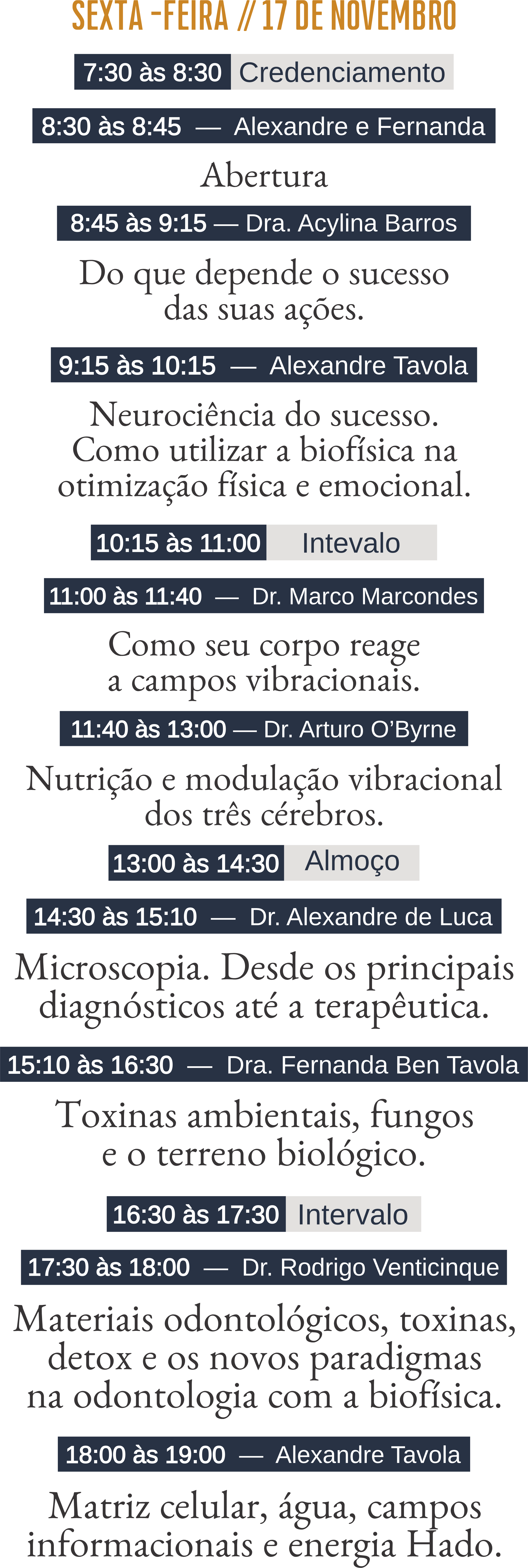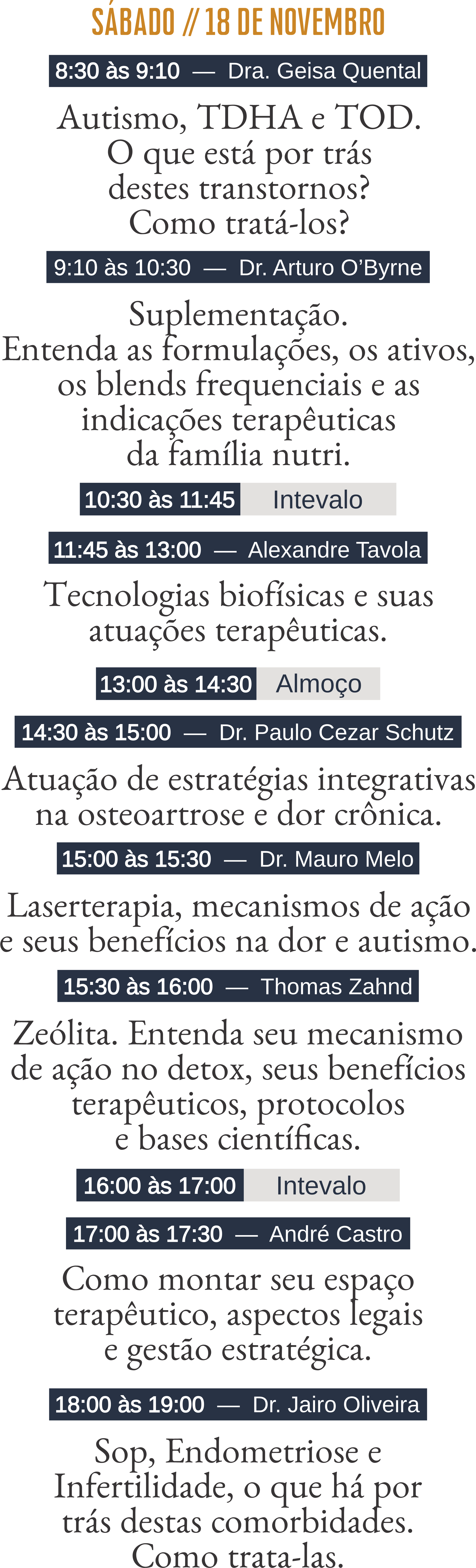 Um total de mais de 8 horas por dia de palestras com especialistas, divididas em 3 turnos.
