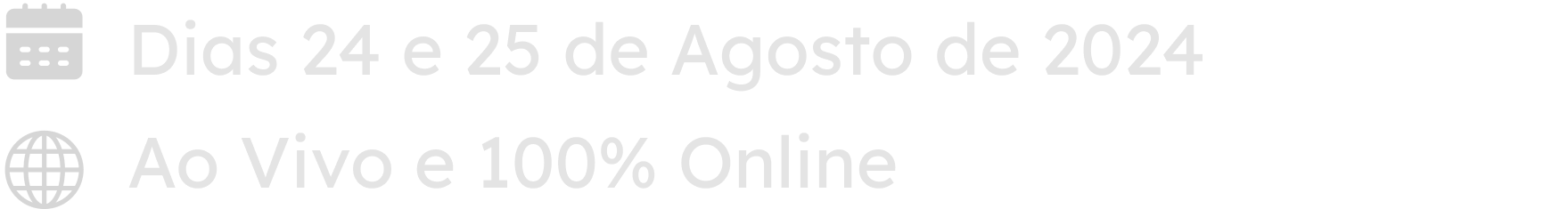 A aula acontecerá ao vivo nos dias 24 e 25 de agosto de 2024, das 9h às 17h, com intervalo para o almoço, podendo se estender um pouco mais no horário ao final da tarde, quando serão respondidas as dúvidas dos alunos.